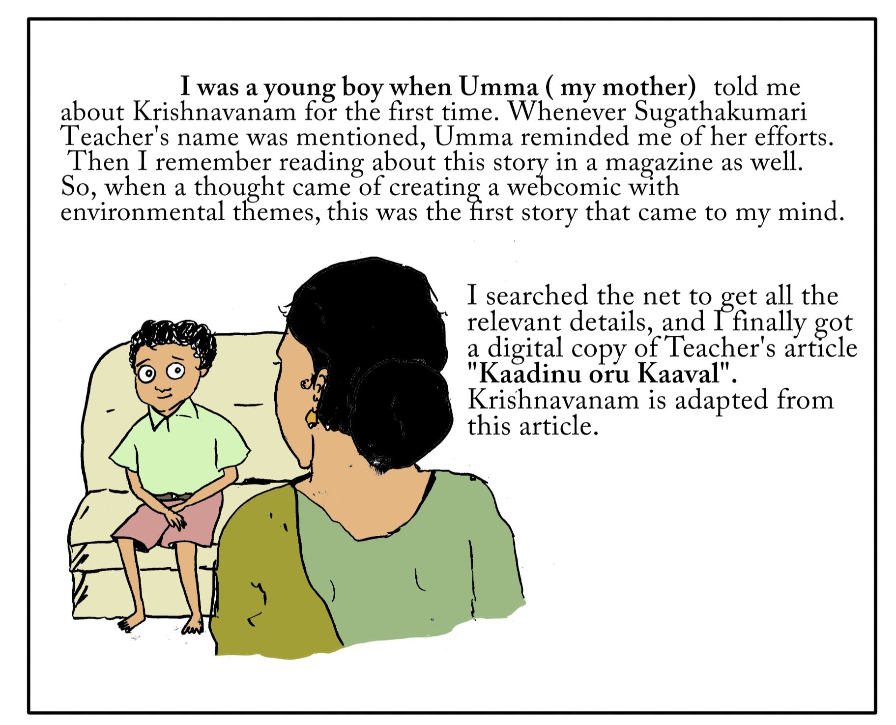 Krishnavanam is a real life comic based on the efforts of poet activist Sugathakumari Teacher to create a forest in a tribal land.